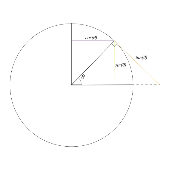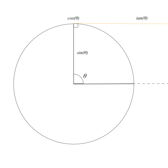 So you now know 2 different ways to get sine, cosine, and tangent. However, tangent is extremely funky. This is because the tangent of θ is the sine of θ divided by the cosine of θ. What happens when we set θ to be 90°, or π/2 radians?