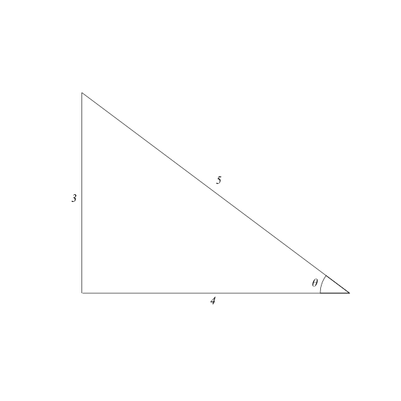 From this, one can conclude that the sine of θ is about 0.6, the cosine of θ is about 0.8, and the tangent of θ is about 0.75. These are the correct values of a 3 4 5 triangle. If you put this value of θ into a calculator, the results would be very slightly off because the angle θ is only an approximation for the angle we were computing.